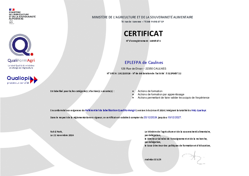 Le CFA - CFPPA de Caulnes est certifié par le label Qualité QualiFormAgri intégrant la totalité du RNQ Qualiopi depuis décembre 2024. Ce label est celui du Ministère en charge de l’Agriculture. Auparavant le CFA - CFPPA de Caulnes était labellisé par l’AFNOR et ce depuis 2021.